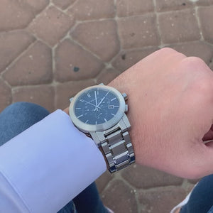Discover the Burberry BU9363 The City Chronograph Men's Watch – a stylish statement of Swiss precision with a blue dial, stainless steel case, and functional chronograph subdials.