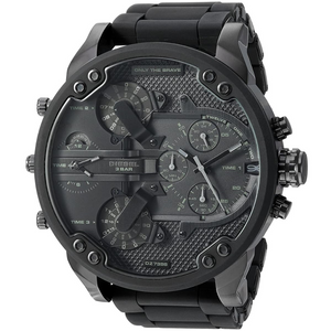 Shop the bold and iconic Diesel DZ7396 Mr. Daddy 2.0 Chronograph Men's Watch at Watch & Watch. Featuring a massive 55x57 mm stainless steel case, black silicone strap, multi-time zone black dial, and chronograph functionality, this timepiece blends rugged design with everyday performance. Water-resistant up to 30 meters and crafted with luminous hands and scratch-resistant mineral crystal, it’s the perfect statement watch for the modern man.