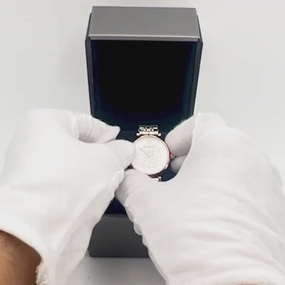 Shop the Emporio Armani AR1926 Ladies Watch for a touch of elegance - featuring a two-tone stainless steel bracelet, sparkling heart detail, and Roman numeral markers, a perfect blend of luxury and sophistication.