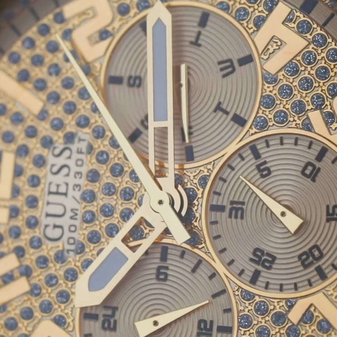 Experience bold luxury with the GUESS W0799G2 Frontier Gold Men's Watch, a dazzling statement piece embellished with crystals and packed with practical features for the fashionable man on the go.