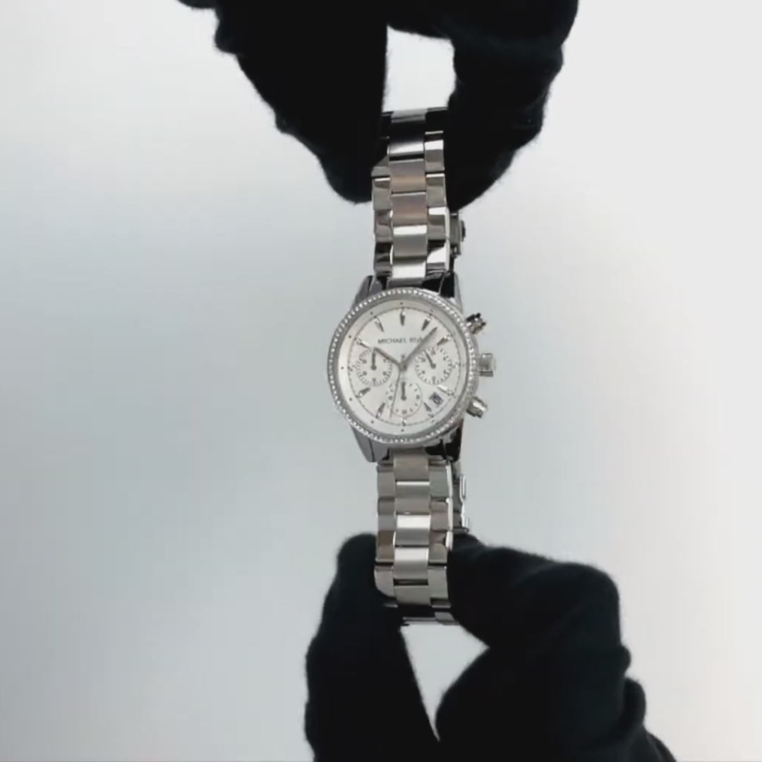 Shop the Michael Kors MK6428 Ritz Chronograph Ladies Watch - a luxurious yet functional timepiece with a silver stainless steel bracelet, crystal-embellished bezel, and versatile design.