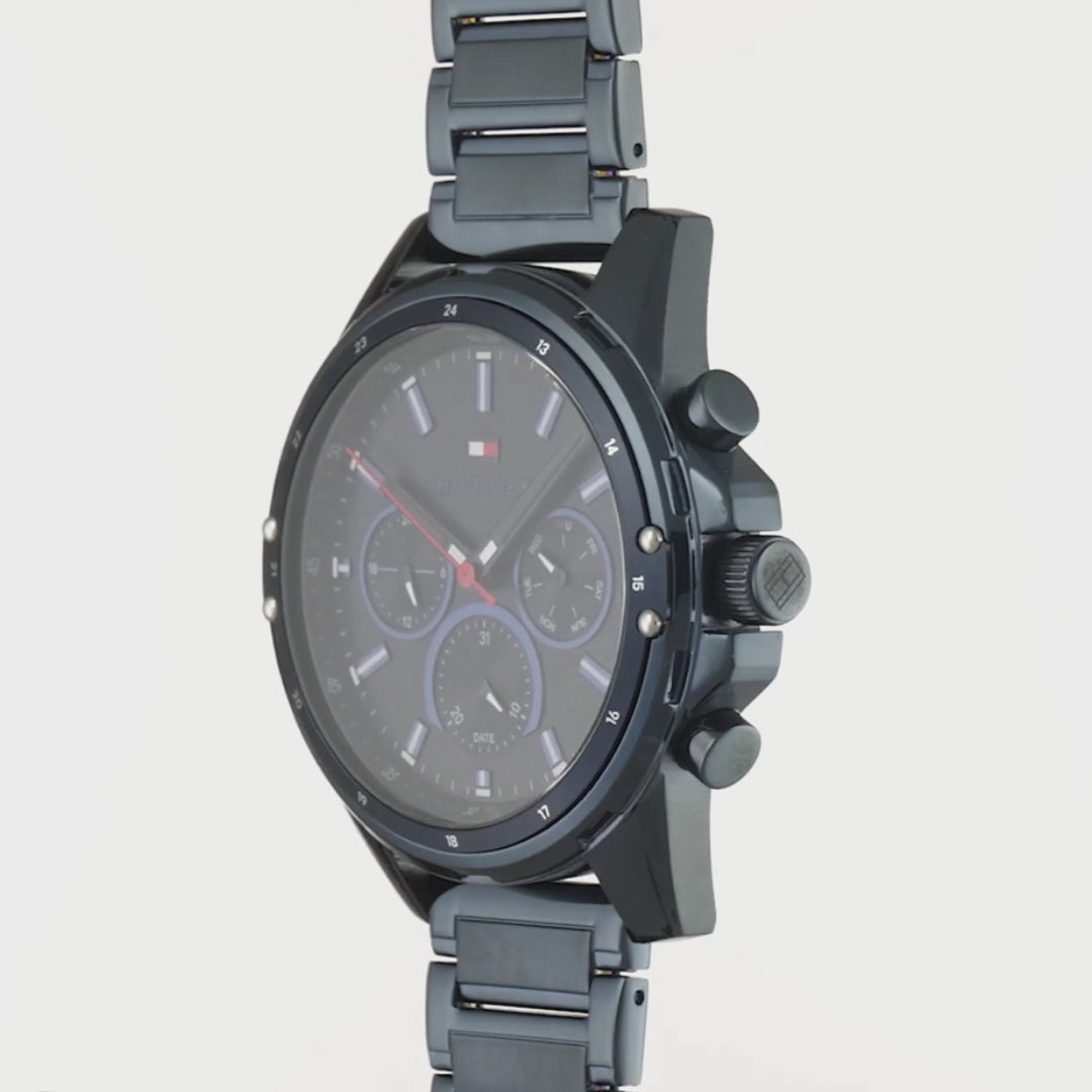 Experience sophistication and functionality with the Tommy Hilfiger Men's Mason Watch - featuring a dark blue dial, gunmetal stainless steel bracelet, day/date displays, and a pop of color with a red second hand.
